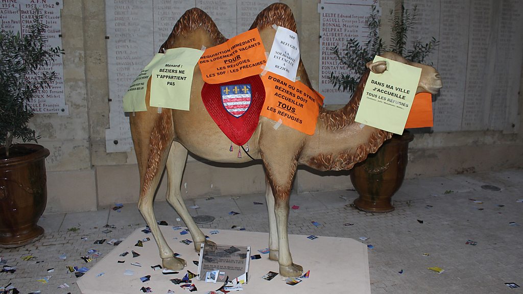 Protestors cover a statue with their messages to Beziers far-right mayor. In the town hall, Robert Menard calls to order a noisy meeting disrupted by demonstrators angered by his attitude to migrants (Photo: Posters are stuck all over a camel by protestors in Beziers’ town hall.)