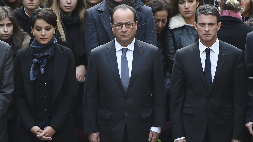 James Coomarasamy in Paris; Molenbeek investigation; life in Raqqa; the view from Beirut. Picture shows French President Francois Hollande flanked by Prime Minister Manuel Valls (right) and Education Minister Najat Vallaud-Belkacem (left) among students at the Sorbonne University during a one-minute silence in Paris. (Credit: Stephane de Sakutin via AP)