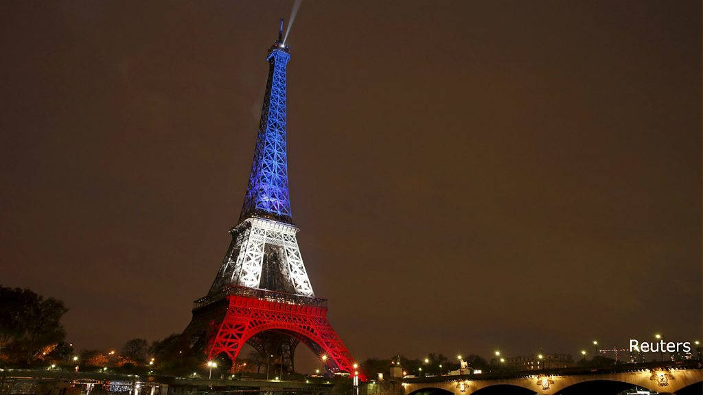 James Coomarasamy in Paris; the Belgian connection; the intelligence failure Picture shows The Eiffel Tower lit with the blue, white and red colours of the French flag in Paris, France, November 16, 2015, to pay tribute to the victims of a series of deadly attacks on Friday in the French capital. (Credit: REUTERS / Benoit Tessier)