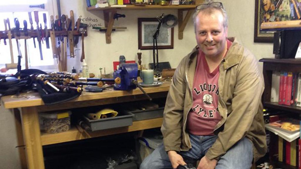 Martin Preshaw, déantóir píoba uilleann, ag insint do Threasa Bhreathnach cad é atá i gceist le píoba uilleann a dhéanamh. Martin Preshaw, uilleann pipe maker, explains to Treasa Bhreathnach what’s involved in making the uilleann pipes