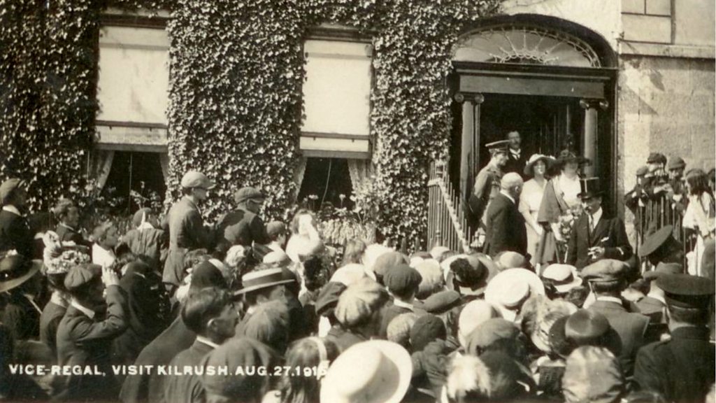 Charles E. Glynn was a big employer in the west coast town of Kilrush during the war years. More than 100 men – a quarter of the workforce – from his flour and feed mill went to the front. But Charles Glynn also spearheaded a major recruitment drive outside of his business. Together with other local businessmen, he organised meetings where men were urged to enlist. Female members of the Glynn family raised funds for the soldiers. They were a Catholic family but did not suffer any political repercussions, even though the Easter Rising was just months away. Throughout the war years, 476 men from Kilrush joined up. Many others from County Clare did so, too – often in a bid to escape from the poverty they faced in this part of Ireland. Charles Glynn’s efforts as a recruitment agent did not go unnoticed. In 1915, he received a visit from the Lord Lieutenant of Ireland, Lord Wimborne, at the family home. Local historian Paul O’Brien has studied the Glynn family papers. His own great grandfather was one of the men who enlisted in Kilrush. He and Charles’ daughter Josephine Glynn are back at Kilrush House, where she was born. Location: Kilrush, Co. Clare 52°38'28.4"N 9°29'09.5"W Image: The Vice Regal party at Kilrush House 1915 Image courtesy of Glynn family papers and Paul O'Brien