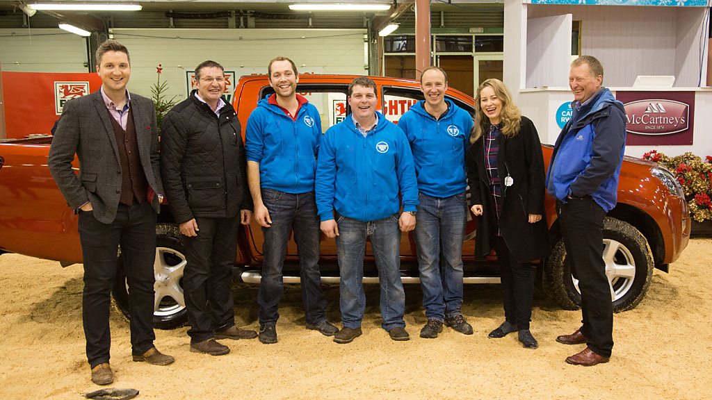 Geraint Lloyd yn llongyfarch Tim y Cyn-Gystadleuwyr - enillwyr 'Fferm Ffactor - Brwydr y Ffermwyr' 2015