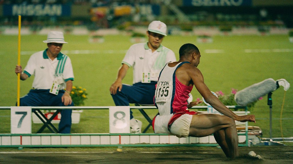 In 1991, Mike Powell and Carl Lewis took on Bob Beamon's iconic Long Jump world record at the World Championships in Tokyo. In an epic battle, both men went further than Beamon, with Mike Powell eventually setting a record that stands to this day. He talks to Adrian Moorhead for Sporting Witness. The programme is a Sparklab Production and was first broadcast in June 2015. PHOTO: Mike Powell breaking the record. Credit: Getty Images.