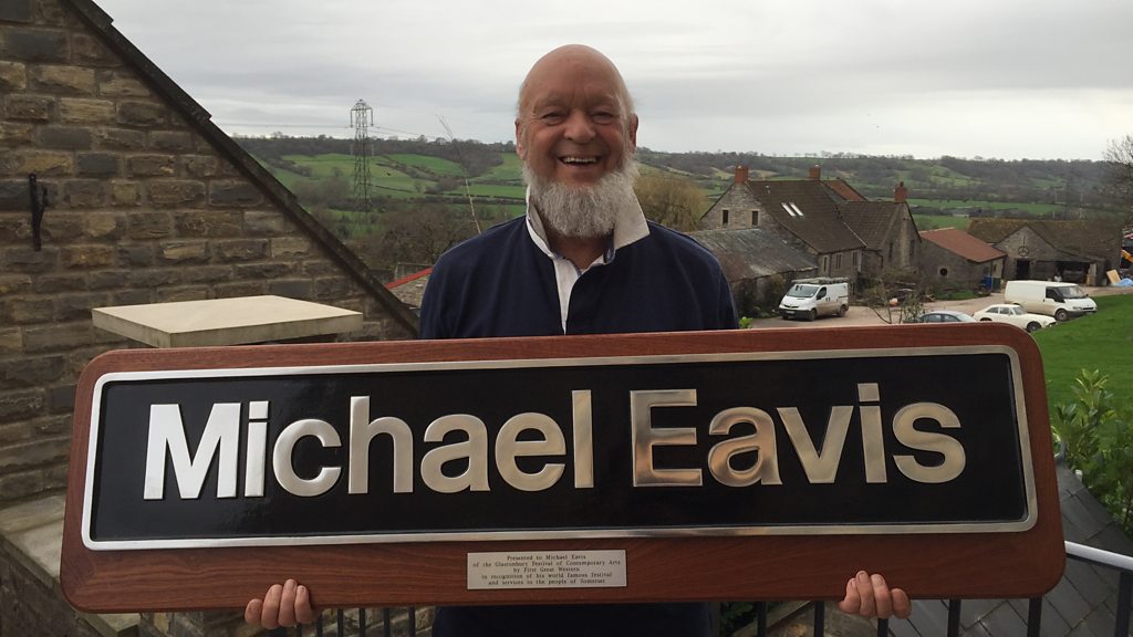 Michael Eavis and Charlie look at the old railway line which crosses Glastonbury Festival