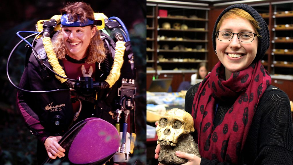 Jill Heinerth is the world's top underwater cave explorer. More people have walked on the moon than have ventured to some of the places she has dived. Originally from Canada, and now living in Florida in the US, Jill has broken records mapping whole water courses underground, and once had a narrow escape from cave-diving in an Antarctic iceberg. She takes photographs and video whilst underground, and says that she would never attempt a dangerous dive just for the thrill of it - there has to be a new discovery to pursue. Elen Feuerriegel is a PhD student from Australia who was catapulted into one of the most exciting scientific discoveries of our time, when her caving experience and slim build led to her joining the Rising Star Expedition. This all-women team excavated over a thousand fossils from a deep cave system in South Africa, which at its narrowest point measures just 18 cm. It was announced in September 2015 that these bones were from a previously unknown species of human ancestor, Homo Naledi. (Photo: (L) Jill Heinerth in diving gear, Credit: Wes Skiles. (R) Elen Feuerriegel holding MH1)