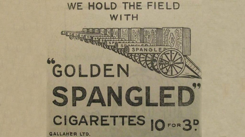 Belfast had a number of tobacco factories which were among the largest employers in the city. Gallaher’s huge factory in York Street was at one time the biggest tobacco factory in the world. At the bottom of Sandy Row lies the building of Murray, Sons and Company, a former tobacco factory, it now houses numerous other businesses and is called Murray’s Exchange. Jonathan Bardon explores Belfast’s tobacco industry and how tobacco and cigarettes were essential for troops morale. Location: Murray’s Exchange. BT12 5DR Image: An advert for Golden Spangled Cigarettes Image courtesy of Nigel Henderson