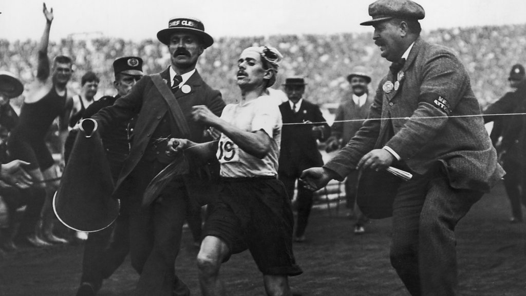 In 1908, hundreds of thousands of Londoners crowded the streets to watch the dramatic events of the Olympic marathon. Dorando Pietri, an Italian sweet-maker from Capri, was first into White City Stadium but he collapsed and had to be helped to the line. He was consequently disqualified and Johnny Hayes of the USA was declared the winner. However, with their love of a gallant loser, the disqualification made Pietri a celebrity for British people and he was greeted with cheers wherever he went. Simon Watts tells his story through newspaper reports from the time. Picture: Dorando Pietri crosses the line, Credit: Hulton Archive/Getty Images