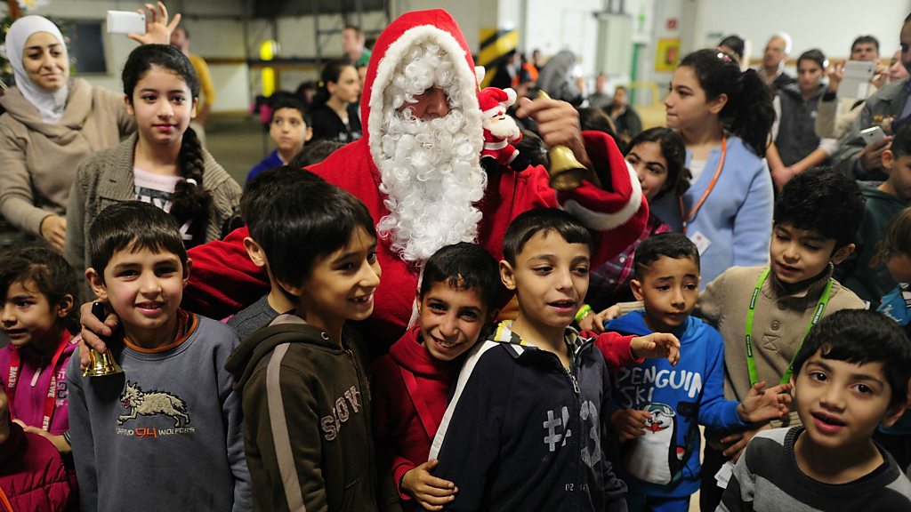 Despite difficult living conditions, Ehtesam, a refugee housed in a former office block in Berlin, says Syrians in Germany should be thankful for the new opportunity given them by Chancellor Angela Merkel to become German citizens. Image: A Syrian migrant dressed as Santa Claus greets children at a shelter for migrants and refugees in Sarstedt, Germany. Credit: Alexander Koerner/Getty Images.