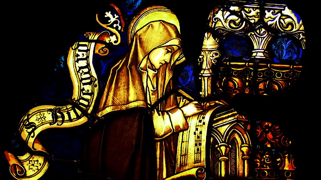 The author Fiona Maddox discusses her book about the medieval German nun, visionary and composer Hildegard von Bingen. Also on the programme: a French film festival of Verdi on film and the Greek violinist Leonidas Kavakos. Image: Stained glass window of Hildegard von Bingen, found in the collection of the Eibingen Abbey. (Credit: Fine Art Images/Heritage Images/Getty Images)