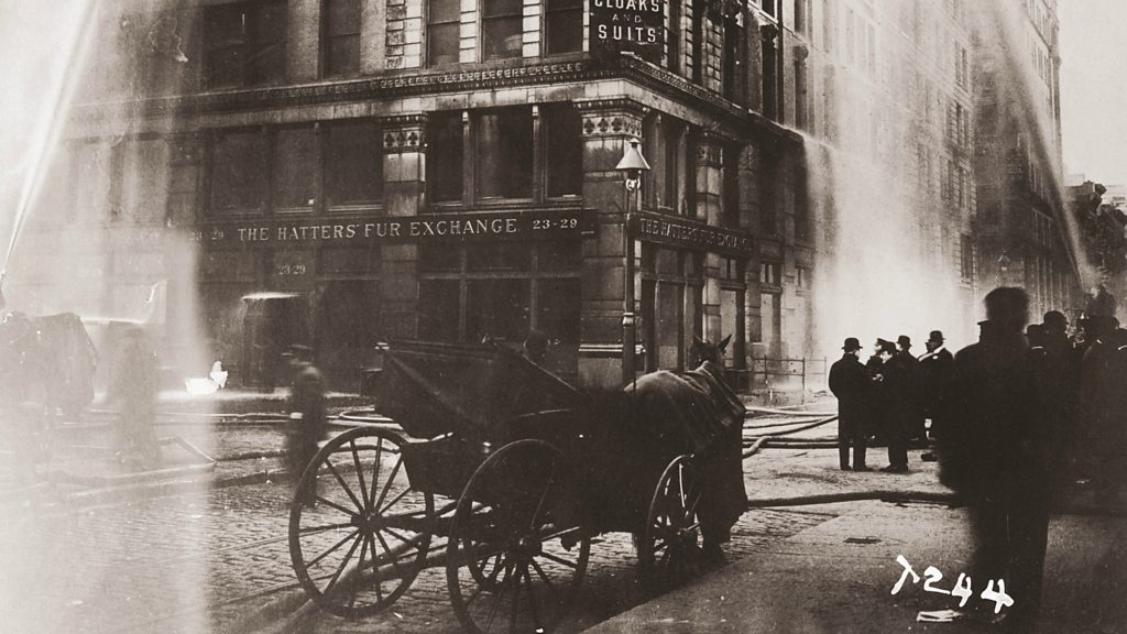 In 1911 a factory fire shocked New Yorkers and was said to have inspired the series of huge economic and social reforms which came decades later, known as the New Deal. Photo: Fire hoses spray water on the upper floors of the Asch Building (housing the Triangle Shirtwaist Company) on Washington and Greene Streets, during the fire in New York City, March 25, 1911. (Photo by Keystone/Getty Images)