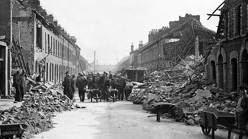 In 1941, Belfast in Northern Ireland was devastated by German bombing. More than a thousand people were killed, thousands more fled the city. Belfast was poorly defended, despite it being a key industrial centre for the British war effort. We hear from two survivors of the Belfast Blitz; Marion Kirkpatrick and Kathleen Regan. Photo: Residents survey the severe damage to houses along a street in Belfast, in April 1941 (AP Images)