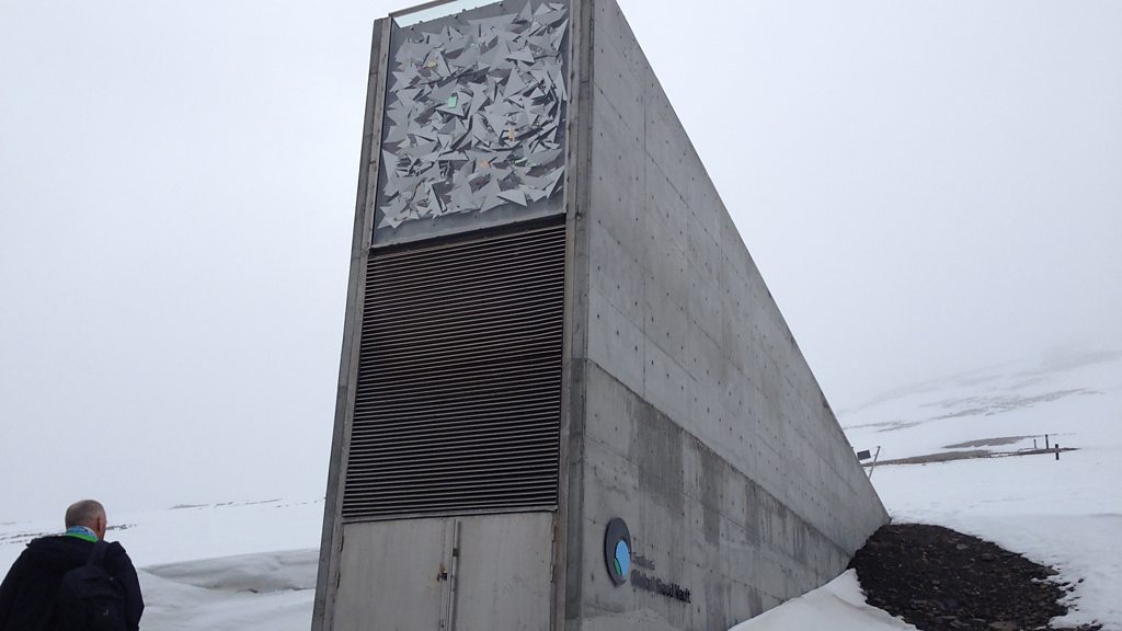 Brina Lainoff from The Crop Trust gives Marnie Chesterton a guided tour through the Seed Vault, dug out of a frozen mountainside on the island of Svalbard, in the Arctic Circle. Photo: Entrance to the Seed Vault, credit: Marnie Chesterton