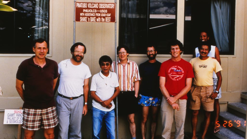 On 15 June 1991 one of the largest volcanic eruptions of recent times occurred at Mount Pinatubo in the Philippines. The volcano had been dormant for over 600 years. The eruption produced high-speed avalanches of hot ash and gas, giant mudflows, and a cloud of volcanic ash hundreds of kilometres wide. Witness has been speaking to volcanologist, John Ewert, who was part of the team monitoring the volcano. (Photo: Clark Airbase Philippines. John Ewert 4th from right. Photo courtesy of John Ewert)
