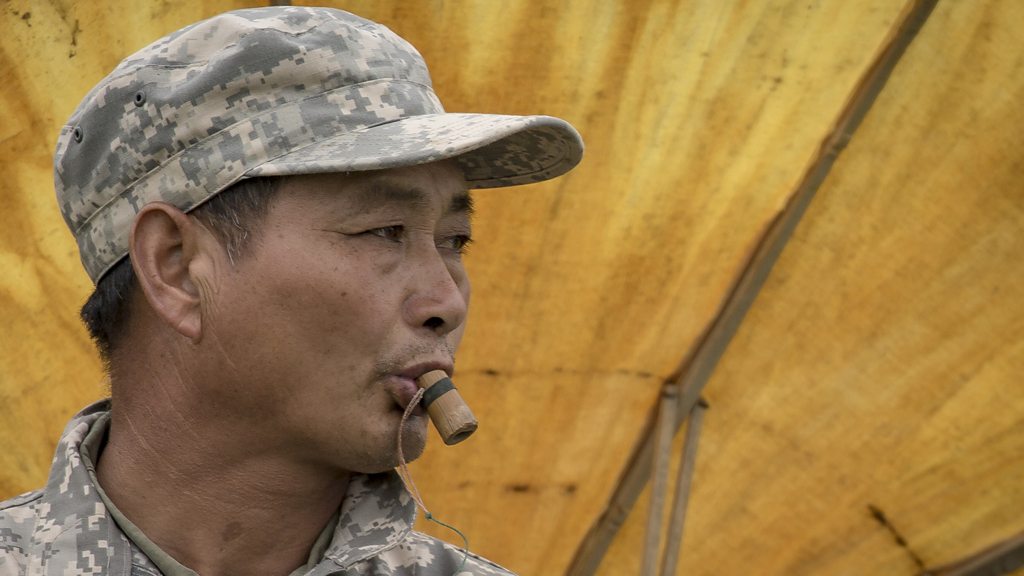 Jin Weiguo, the bird trapper of Chongming Island. He switched from hunting shorebirds for the pot to catching them for conservation science. For more than 40 years, Jin Weiguo has hunted shorebirds on Chongming Island, near Shanghai. In the last decade, Mr Jin has caught birds only for conservation research as an employee of Chongming Dongtan Nature Reserve. The birds are fitted with ID bands and flags so their lives and fortunes can be tracked by scientists from Russia to Australia. His traditional trapping method includes imitating the calls of the many wader species which migrating through the reserve. He mimics them on a bamboo whistle. With bird book in hand, Ann Jones asks Mr Jin to run through part of his repertoire. Credit: Ann Jones