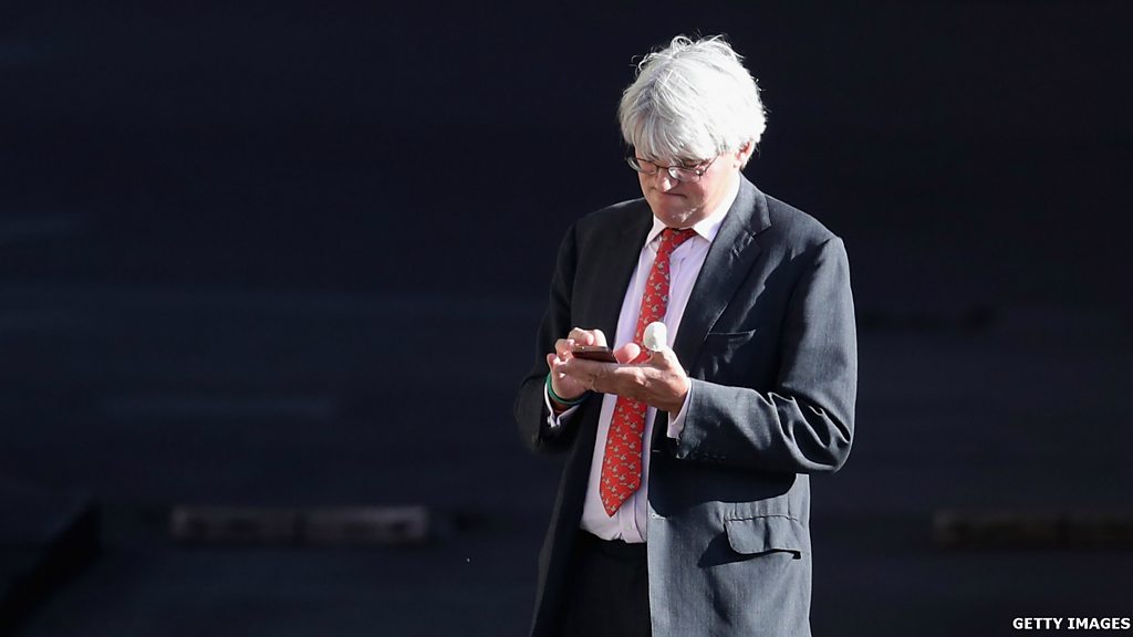 Andrew Mitchell MP responds to the text sent out by Nick Boles, who is behind Michael Gove's campaign, which criticised fellow candidate Andrea Leadsom. Mr Mitchell, who is backing Mr Gove, said there are "lots of texts and emails flying around" and that the electorate will make up their own minds. (Image: Andrew Mitchell looking at a mobile phone. Credit: Getty Images.)