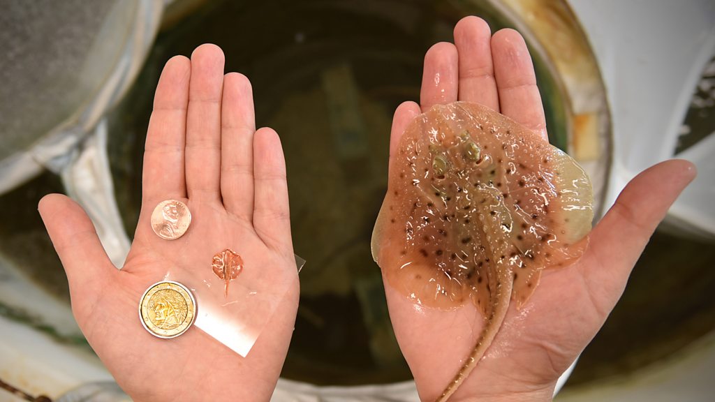 Professor Kevin ‘Kit’ Parker explains the design of a miniature robotic stingray. Along with a gold skeleton and a gel-like biomaterial, it contains a single layer of hearts cells from a rat. These cardiac cells were engineered to be responsive to light. Using specific wavelengths as a guidance system, the robot is able to negotiate a small obstacle course. The motion of the stingray would help us understand how the human heart pumps blood and the resulting diseases. Photo: Tissue-engineered soft-robotic ray and a little skate, Leucoraja erinacea/Karaghen Hudson