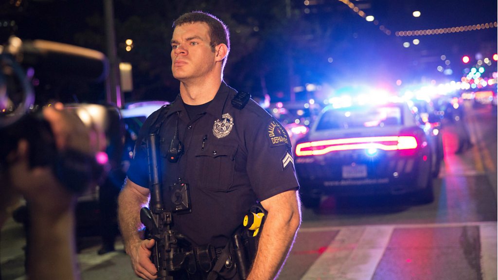 Will Rilley works in downtown Dallas at the Crown Plazza hotel, which is close to the site of the shootings. He explained that some of his colleagues could see what was happening from the roof. (Photo: Police officer standing guard after sniper shooting in Dallas. Credit: Getty Images.)