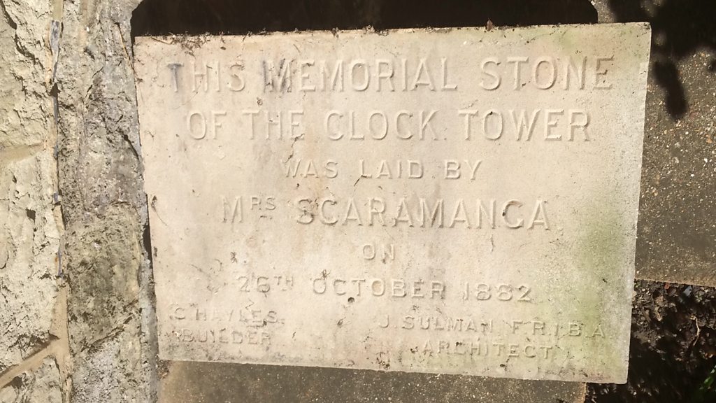 There have been three buildings of worship on the site of the United Reformed Church in Shanklin. The building stands at the heart of the town in the High Street and was only made possible thanks to benefactors who are commemorated with memorial stones. But there is one stone that has left the members puzzled. It was laid by Mrs Scaramanga in 1882 at the reconstruction of the clock tower. But nothing is known about the lady, or the whereabouts of the commemorative trowel she used to cement it into place. BBC Radio Solent's Neil Sackley has been delving into the history of the building with the Church's Graham Bedwell.
