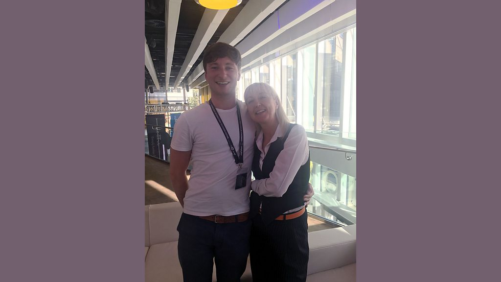Ramsay McMahon a' còmhradh ri Cathy aig Fèis Eadar-Nàiseanta Telebhisean Dhùn Èidinn
