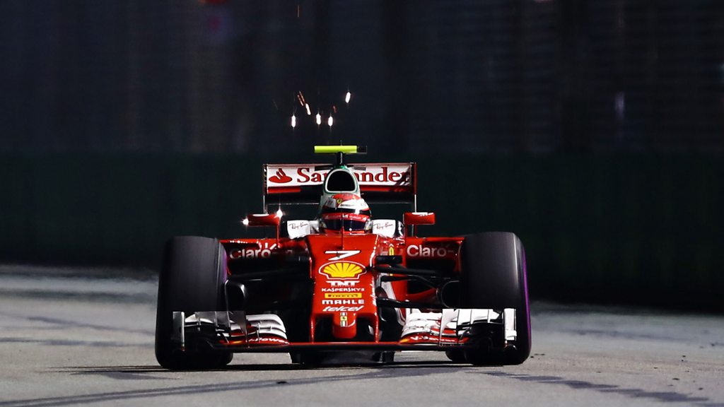 Ferrari Kimi Raikkonen overtakes Lewis Hamilton's struggling Mercedes to take third. This clip is originally from 5 live Formula 1 on Sunday, 18 September 2016.