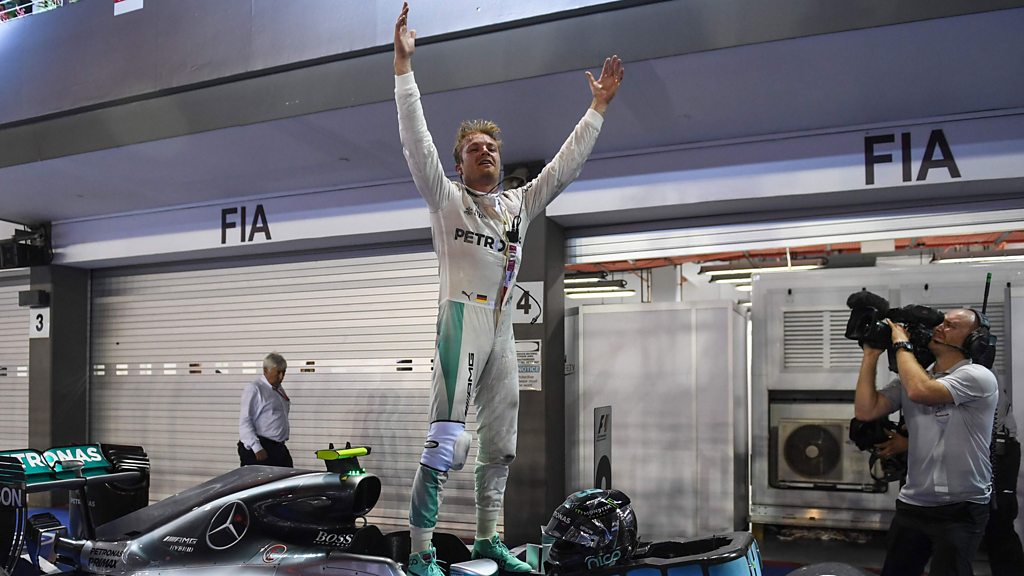 Mercedes' Nico Rosberg wins the Singapore Grand Prix by 0.4 seconds from Red Bull's Daniel Ricciardo to extend his championship lead to eight points. This clip is originally from 5 live Formula 1 on Sunday, 18 September 2016.