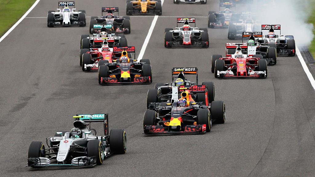 Mercedes' Lewis Hamilton drops from 2nd to 8th after suffering from wheelspin at the start. This clip is originally from 5 live Formula 1 on Sunday, 9 October 2016.