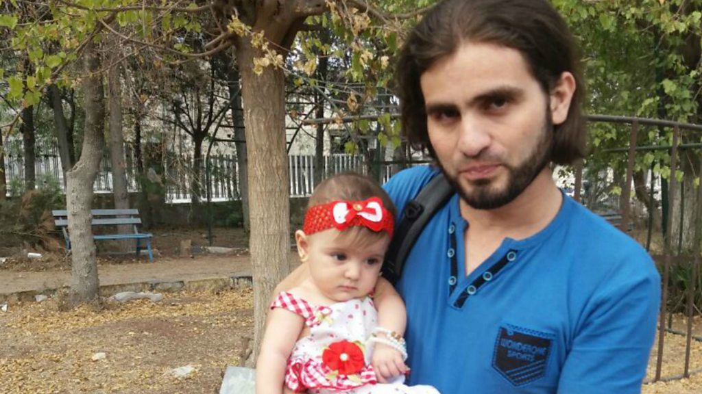 Abdulkafi Alhamdo teaches English in eastern Aleppo. Bombs go off above his classroom and shelling interrupts his lessons but he continues to teach his students. Photo: Abdulkafi Alhamdo with his daughter, Credit:Abdulkafi Alhamdo
