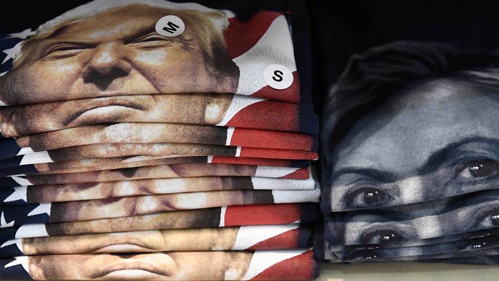 'We should not spend more time thinking about Donald Trump's policy ideas than he spent thinking them up': Professor Austan Goolsbee, economic adviser to Hillary Clinton talks tax with Diana Furchtgott-Roth, economic adviser to Donald Trump. (Photo: T-shirts supporting the US election candidates in a gift shop at Philadelphia International Airport, Pennsylvania. Credit: Robyn Beck/AFP/Getty Images)
