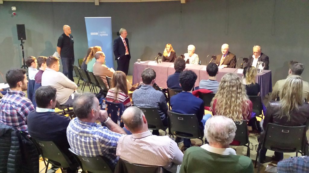Dewi Llwyd sy'n arwain y drafodaeth wrth i bobl Aberystwyth gael yr hawl i holi.