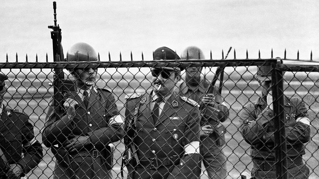 In November 1973, Chile played an international football game at the National Stadium in Santiago even though it was being used as a torture centre following General Pinochet's coup. Chile were due to face the Soviet Union, but the USSR boycotted the match, which the Chileans ended up playing against no opposition in a virtually empty stadium. Robert Nicholson talks to the Chilean captain, Leonardo Veliz. The programme is a Whistledown Production. PHOTO: General Pinochet's troops guarding the National Stadium in Chile in 1973 (Getty Images)