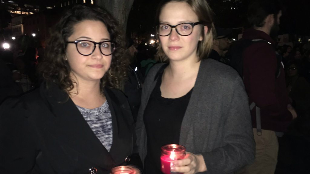 While supporters of Donald Trump have been celebrating an exceptional win at the polls, those who backed Hillary Clinton are left reeling from her defeat. The BBC's Shaimaa Khalil went to an impromptu candlelight vigil outside the White House in Washington DC and met Jenny and Logan. (Picture: Jenny and Logan holding candles; Credit: BBC)