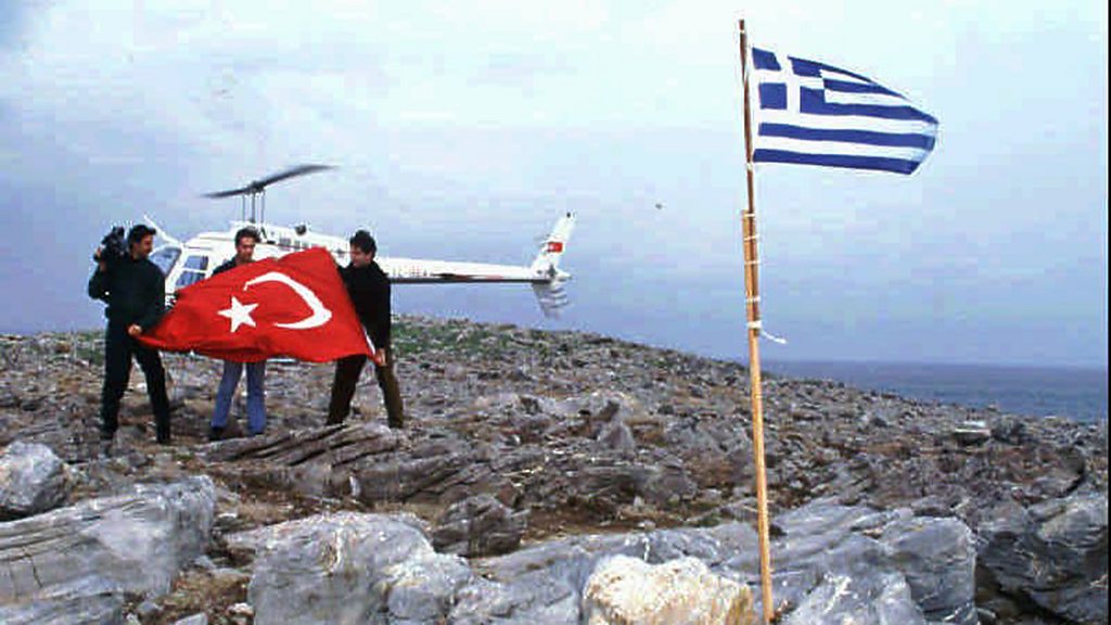 A Turkish cargo ship ran aground on a tiny rocky island in the Aegean Sea in December 1995. But a dispute between Turkey and Greece over who owned the island sovereignty almost brought the two nations to war. Agreement still hasn't been reached over the territory called Kardak by the Turks and Imia by the Greeks. Cagil Kasapoglu spoke to the former Turkish diplomat Onur Oymen and the former Greek foreign minister, Theodoros Pangalos, about the crisis. Photo: Turkish journalists prepare a Turkish flag to replace the Greek flag on Kardak/Imia island, January 27, 1996 (AP Photo/Hurriyet)