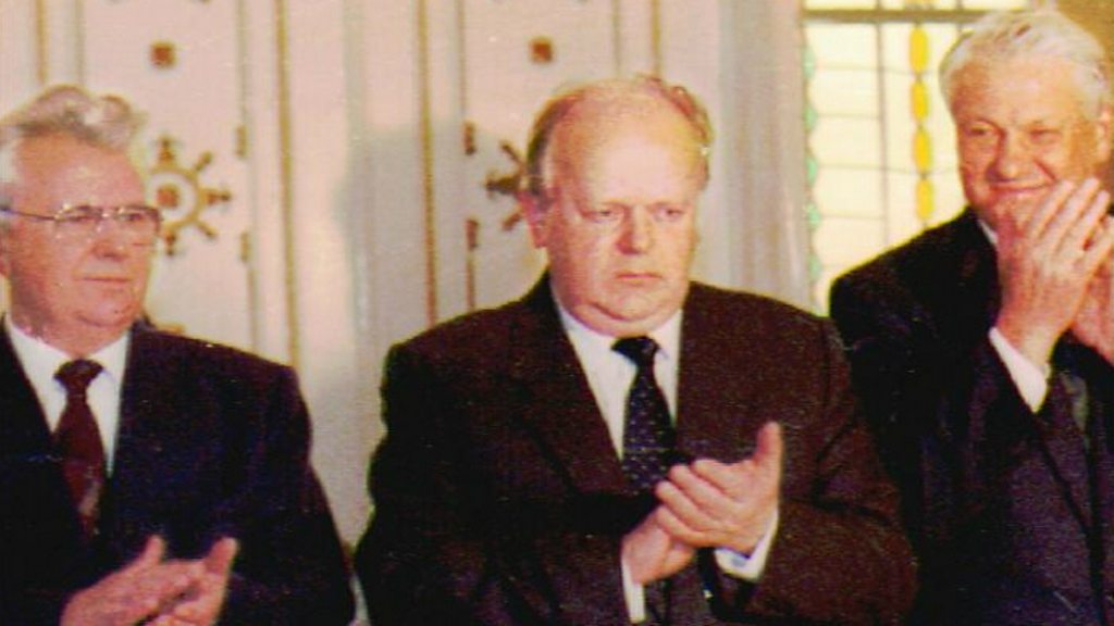 In December 1991 the leaders of three Soviet Republics - Russia, Ukraine and Belorussia - signed a treaty dissolving the USSR. They did it without asking the other republics, and against the wishes of the USSR's overall President Mikhail Gorbachev. By the end of the year Gorbachev had resigned and the Soviet Union was no more. Dina Newman has spoken to the former President of Belorussia, Stanislav Shushkevich, and the former President of Ukraine, Leonid Kravchuk, who signed that historic document alongside Boris Yeltsin. Photo: the leader of Ukraine, Leonid Kravchuk, the leader of Belorussia, Stanislav Shushkevich and the leader of Russia, Boris Yeltsin at the signing ceremony. Credit: AP