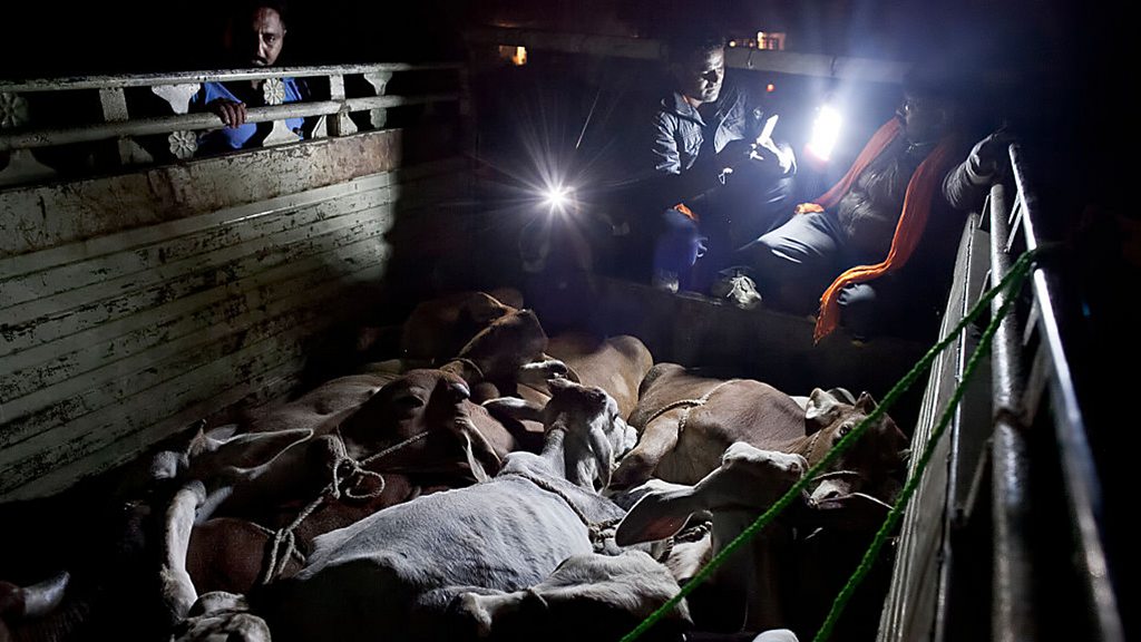 Jill McGivering joins a group of right wing Hindu extremists in India as they chase a lorry full of cows which they are intent on protecting from the slaughterhouse. Image Copyright: Allison Joyce/Getty