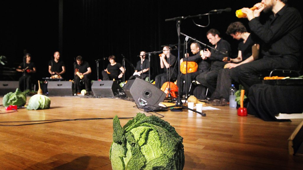 Meet the band that makes detailed music from vegetables and hear them play 'Brazil' - their tribute to the film of the same name by Terry Gilliam. (Image: An orchestra with vegetables on stage. Credit: Patrick Bernard/ Getty Images)