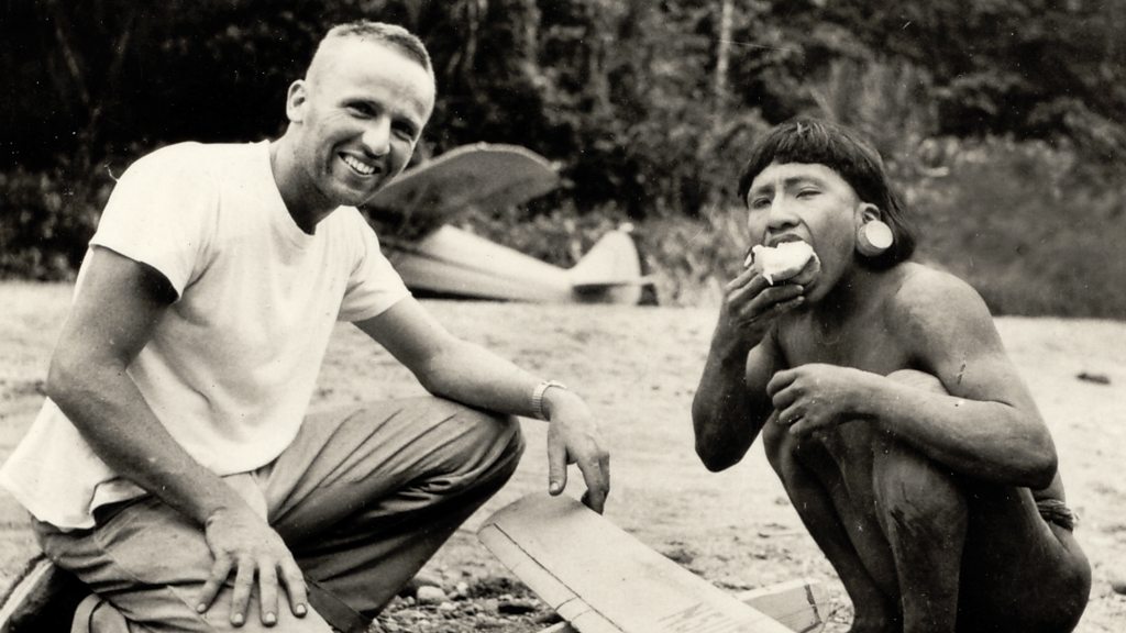 In January 1956, members of the Auca tribe in Ecuador attacked and killed five American missionaries. They had made contact with the isolated tribe to try to convert them to Christianity. Mike Lanchin speaks to Steve Saint and Valerie Shepard, children of two of the victims, who later met their fathers' killers. Photo: Nate Saint and Wao, a member of the Auca tribe, January 1956 (courtesy of Saint family)
