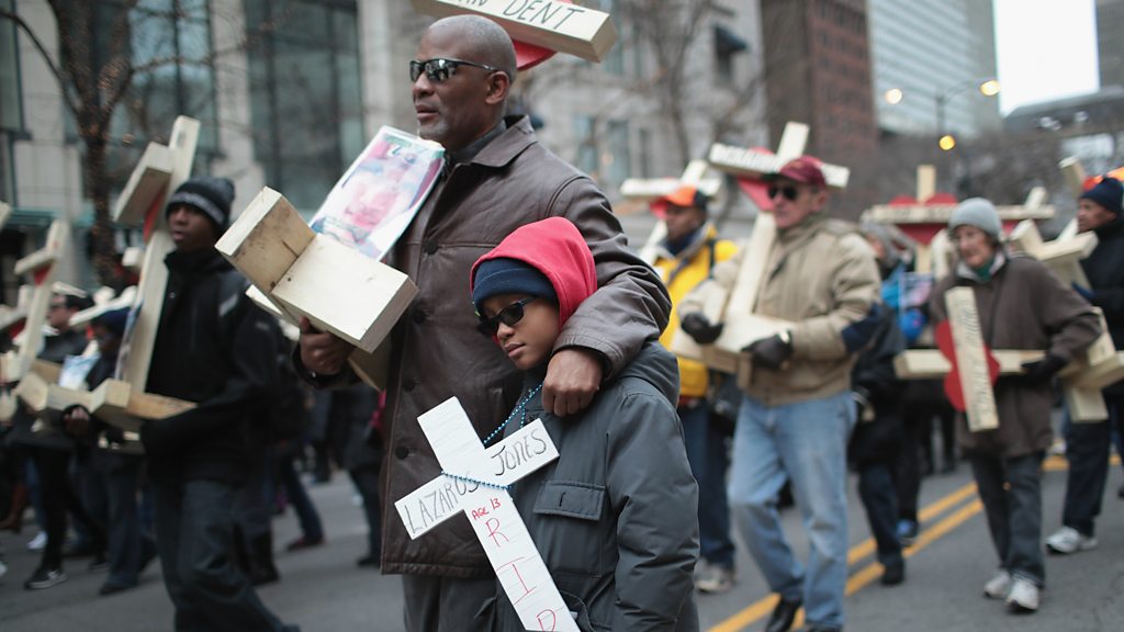 In 2016 the murder rate in the American city of Chicago went up by 50% - there were were 762 killings. That's more killings in Chicago than Los Angeles and New York combined. The fact other cities have far lower levels of violence raises the question - what are they doing right? How have they brought murder rates down? Join Owen Bennett Jones and his panel of experts discussing the social, economic, political and policing issues that lie behind the numbers and the possible solutions to dealing with urban violence. (Photo: A march in Chicago to commemorate victims of gun violence held on New Year's Eve 2016. Credit: Getty Images)