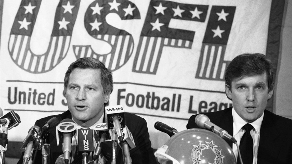 As Donald Trump takes charge of the world's most powerful nation we head back to the early 1980s when his goals were slightly more modest. One of his ambitions was to own a sport franchise and he coveted an NFL team. Unable to make this happen, he purchased the New Jersey Generals American football team of the newly formed USFL. Within two years the league had collapsed and many blame Trump for its demise. The BBC's Joel Hammer reports Photo: Donald Trump (R) at a press conference for the New Jersey Generals of the USFL Credit: AP