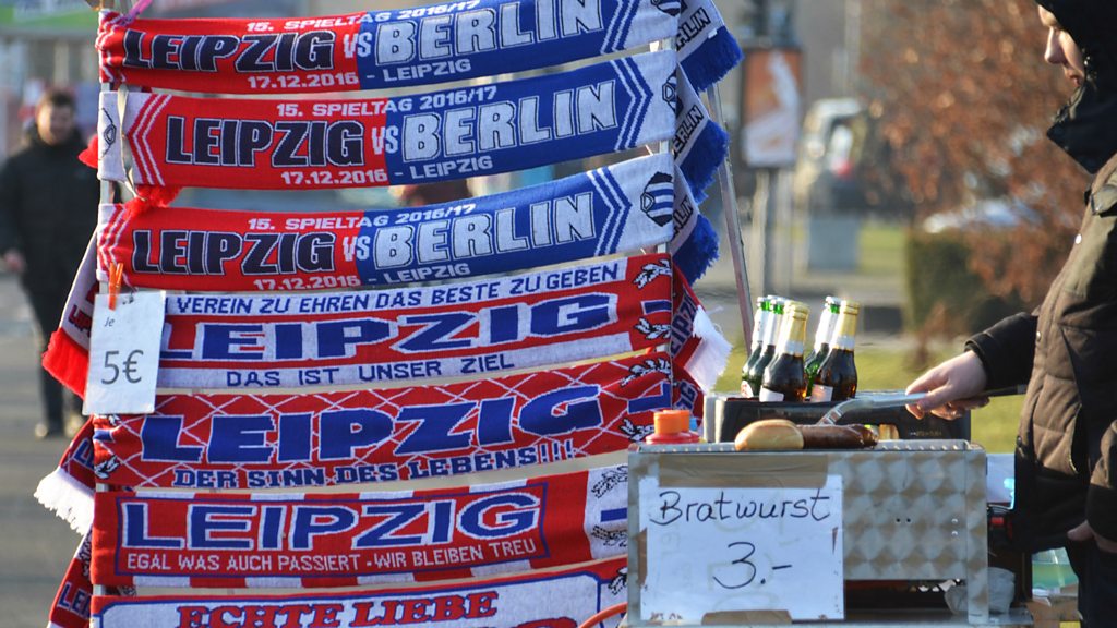 RB Leipzig, a German football team, has been hugely successful in its short eight-year existence. But it is widely derided in much of Germany as the creature of a multinational company more interested in selling cans of energy drink than winning football matches. At the halfway point of the season RB Leipzig is second in the Bundesliga, behind only the perennial champions Bayern Munich, having started life at the fifth level of German football playing in front of 2,000 spectators. RB stands for RasenBallsport, which translates roughly as “lawnball”. But everyone knows that RB really stands for Red Bull, which bought the team in 2009. In one protest this season fans in Dresden threw the severed head of a bull onto the pitch. Tim Mansel reports for Assignment on the rise of RB Leipzig and what it tells us about the continuing east/west divisions within Germany. (Photo: RB Leipzig football scarves on sale at outside the club's stadium. Credit:Tim Mansel)