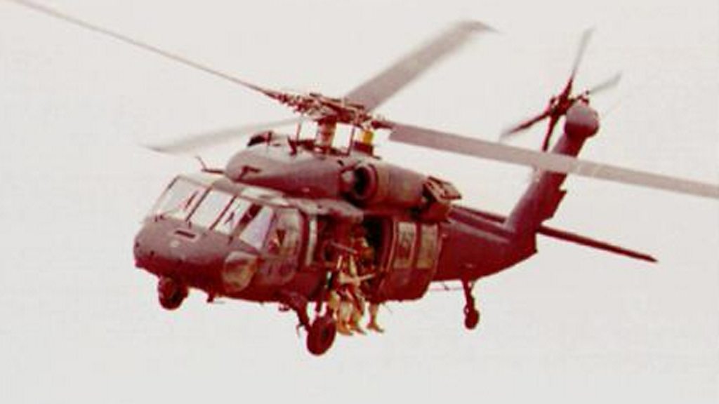 In 1993, the United States launched a disastrous raid against the forces of the Somali warlord General Mohamed Farah Aideed. During the operation, two American Black Hawk helicopters were shot down, 18 American troops were killed, dozens more were injured. Somali casualties were estimated to be in the hundreds. The disaster would have a major impact on US foreign policy in Africa and was made famous by the film Black Hawk Down. We hear a Somali account of the operation, and from one of the American helicopter pilots who was shot down during the raid. (Image: UH60 Blackhawk US Army Gunship patrolling Mogadishu. Credit: AP)