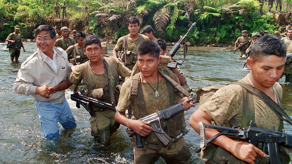 In early 1995 Peru and Ecuador went to war over a strip of land that both claimed to be theirs. The "Cenepa War" was the last time that two armies from Latin America fought each other. As many as 500 people were thought to have died in the brief conflict. Mike Lanchin has been hearing from (retired) Lt. Col. Juan Alberto Pinto Rosas, who led his troops in the cross-border fighting. Photo: Peruvian President Alberto Fujimori poses with soldiers in the Cenepa River at the border with Ecuador. (AFP/Getty Images)