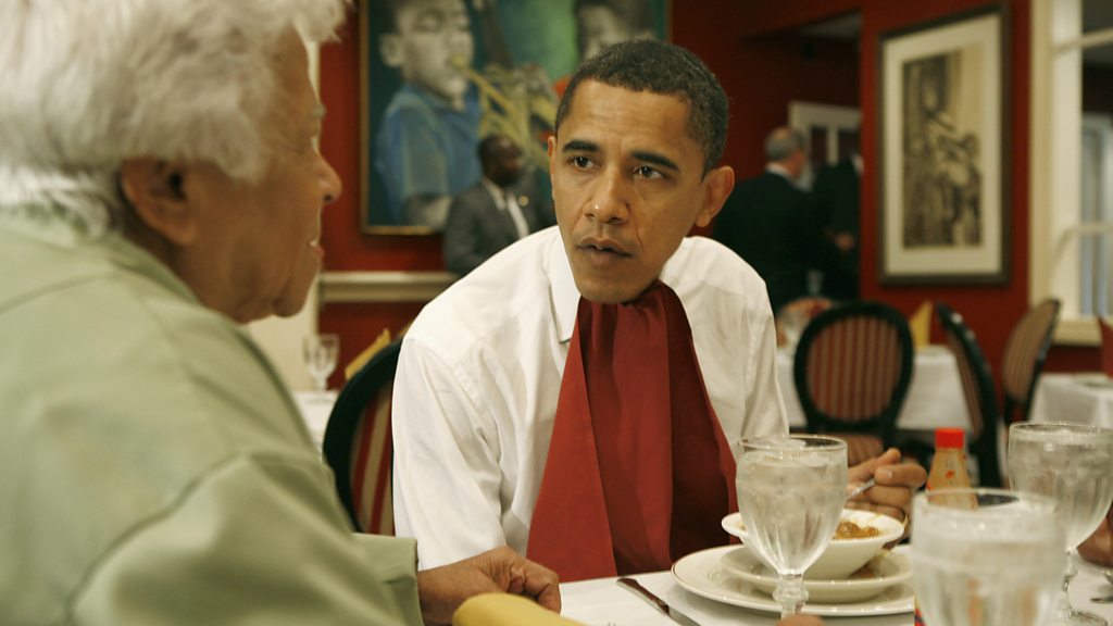 Leah Chase, who has been cooking for 70 years in the Dooky Chase restaurant in the Tremé neighbourhood of News Orleans, Louisiana, tells us how she cooked for two former US presidents. First, George W. Bush, and then Barack Obama. She tells the BBC's Dan Saladino her thoughts when she discovered that President George W. Bush was coming to eat at her restaurant. (Image: Barack Obama talking to Leah Chase in Dooky Chase restaurant. Credit: Emmanuel Dunant/ Getty Images)