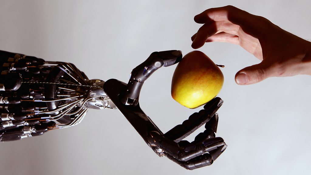 Robots, artificial intelligence and automation are spreading beyond the assembly line to compete for many of our jobs. Economists forecast that as many as half of current jobs in the developed world could be lost to computers in a generation, and as many as two-thirds in manufacturing-heavy China. But what about the new jobs that will emerge? And could we be at the threshold of a world in which robots do all the unpleasant work leaving us free finally, in the words of JM Keynes, to learn how to live ‘wisely, agreeably and well’? (Photo: Robot hand holding an apple. Credit: Getty Images)