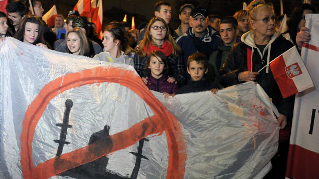 Members of the audience discuss how Muslims are viewed in Poland. This was recorded during a World Questions debate in Warsaw, Poland. (Photo Image: Right-wing nationalist protesters hold a banner with crossed out mosque on Poland's National Independence Day in Wroclaw on November 11, 2015 Photo credit: Natalia Dobryszycka/AFP/Getty Images)