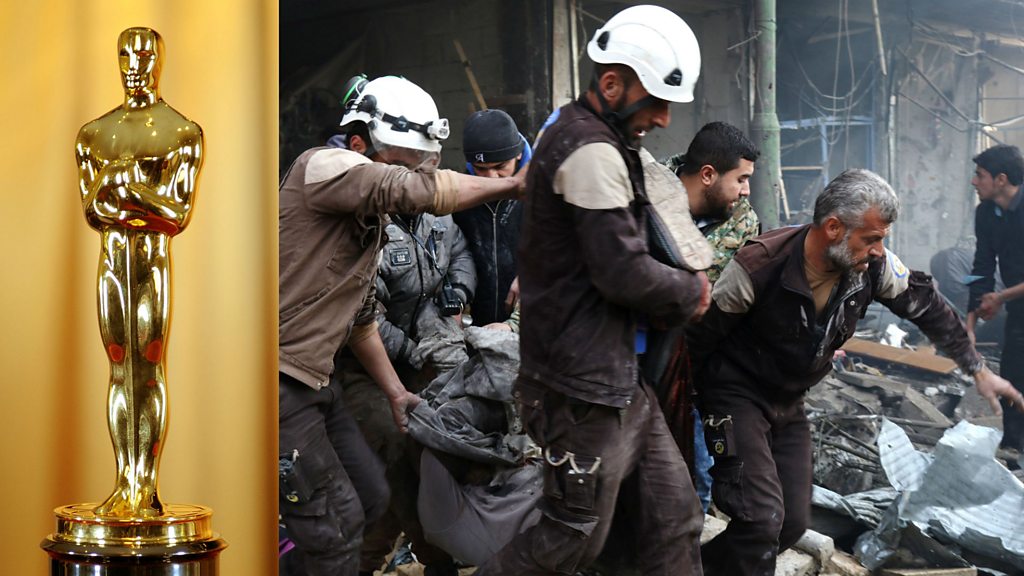 ‘The White Helmets’, a film about the 3,300-strong volunteer rescue group that operates in rebel-held parts of Syria has won the Oscar for best short documentary. Abed Abdulrahman, a spokesperson for the group explains how the victory was bittersweet. (Photo: An Oscar Statue / White Helmet rescuers in Idlib, Syria Dec 2016. Credit: Andrew Walker / Mohamed Al-Bakour)