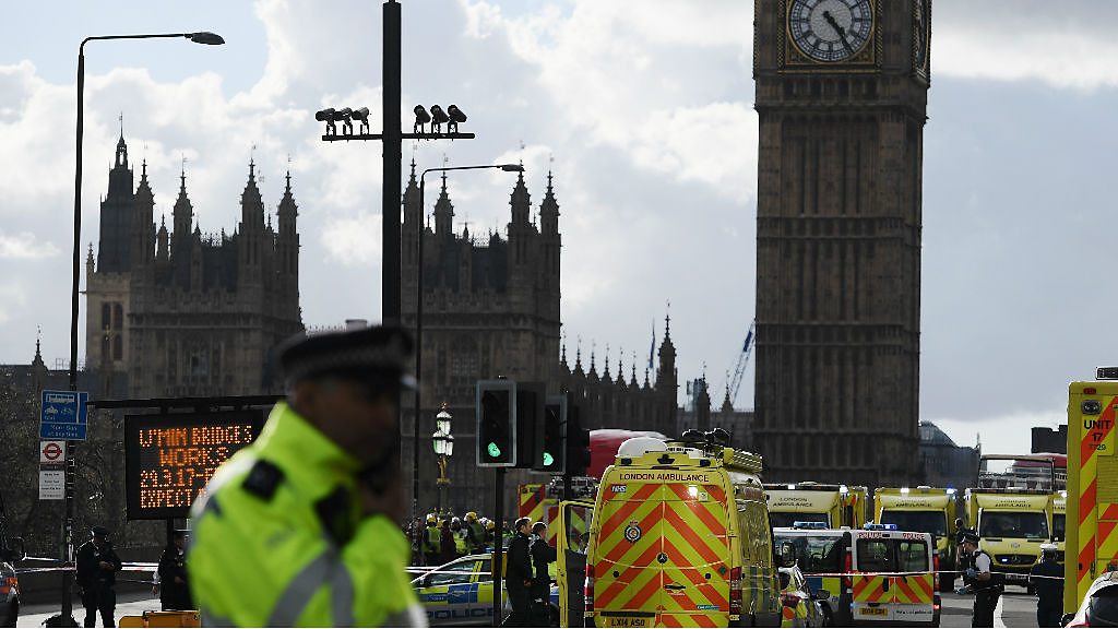 We hear the latest from the incident at the Houses of Parliament, where a vehicle hit people on Westminster Bridge, in a suspected terror attack. Picture: Ambulances, police vehicles and emergency services seen on Westminster Bridge, in London, England