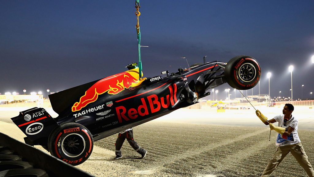 Red Bull's Max Verstappen crashes out of the Bahrain Grand Prix after his brakes failed. This clip is originally from 5 live Formula 1 on Sunday, 16 April 2017.