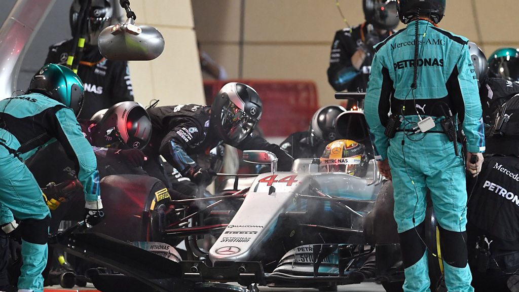 Mercedes' decision to stack Valtteri Bottas & Lewis Hamilton during the first pit stop backfires. This clip is originally from 5 live Formula 1 on Sunday, 16 April 2017