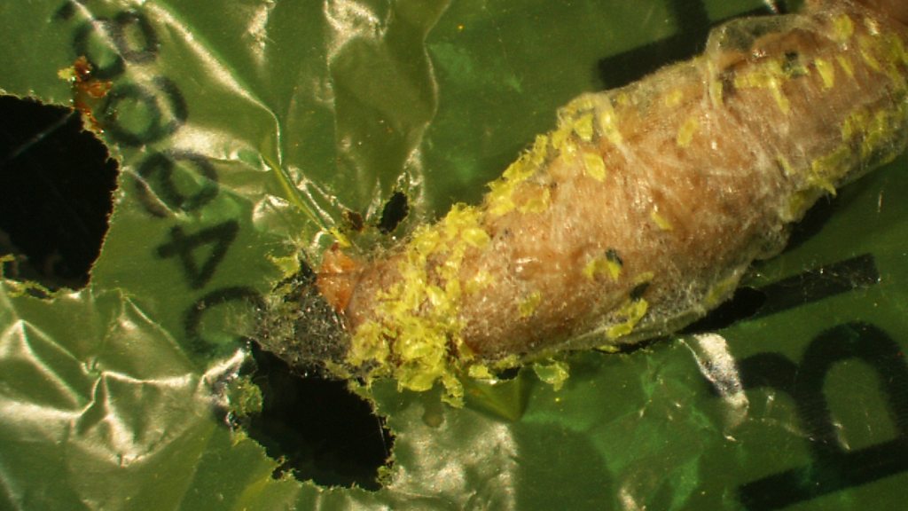 Polythene from plastic bags and bottles is polluting every corner of the Earth. So when a colleague of Professor Chris Howe, at University of Cambridge, discovered wax moth caterpillars can eat plastic, they wanted to find out whether it could be a useful tool to clear up waste plastic. Image: A wax worm chews a hole through plastic. Polyethylene debris can be seen attached to the caterpillar. Credit: Federi