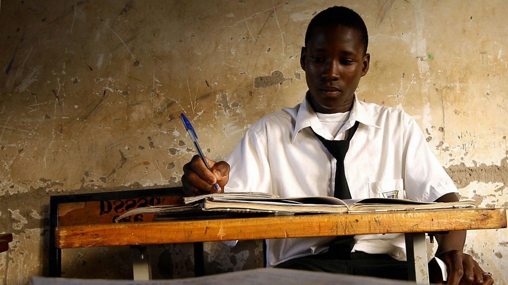 The struggle to get a good education, in an overpopulated school system. With a median age of under 16 years old, Uganda is one of the most youthful countries in the world, but the sheer number of young people means that many struggle to get a good education. A disturbing number are entirely unschooled, or have dropped out of class due to poverty or for other reasons. Others are impressive, with their determination to succeed, even in difficult circumstances. The BBC’s Alan Kasujja travels back to the country of his birth to meet young people at various stages of learning. Image: A boy at a desk in a Ugandan school, Credit: AFP/Getty Images